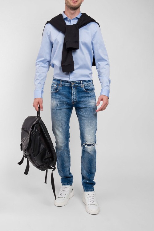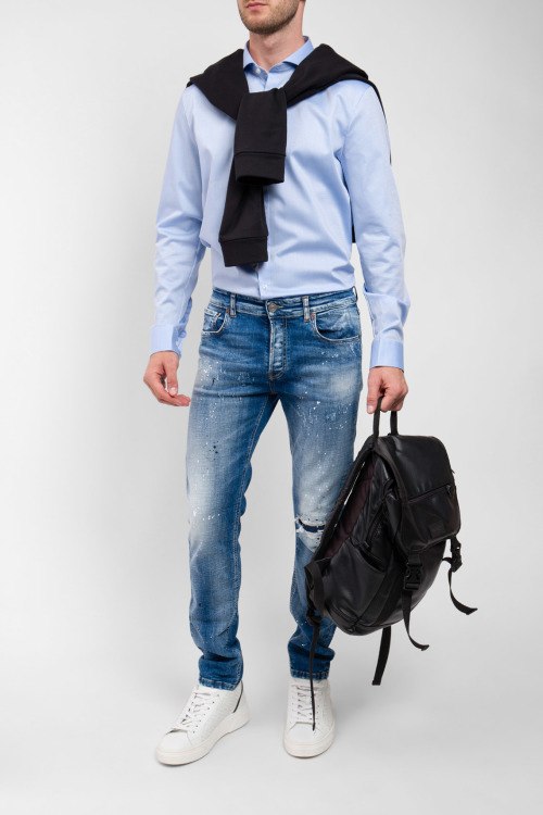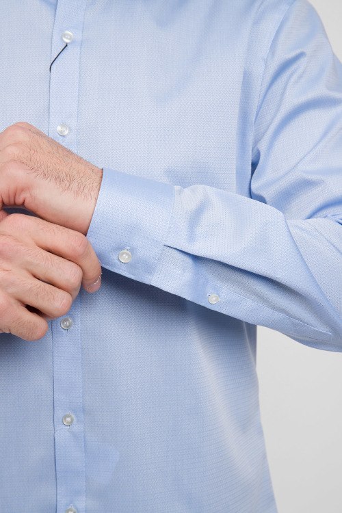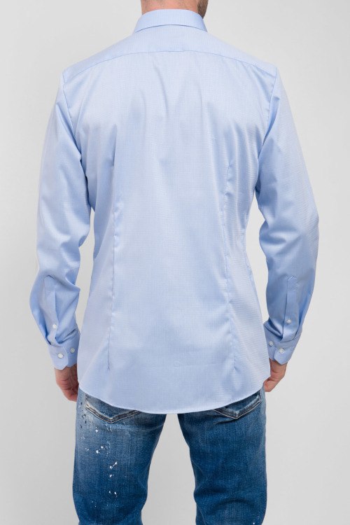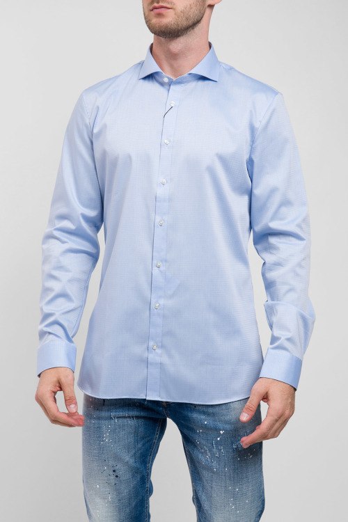 Мужская голубая рубашка из хлопкового микса от Olymp (Олимп). Классический воротник, застежка на пуговицы, длинные рукава, манжеты на пуговицах, дизайн с плетенным узором по всей поверхности изделия, фигурный низ изделия.