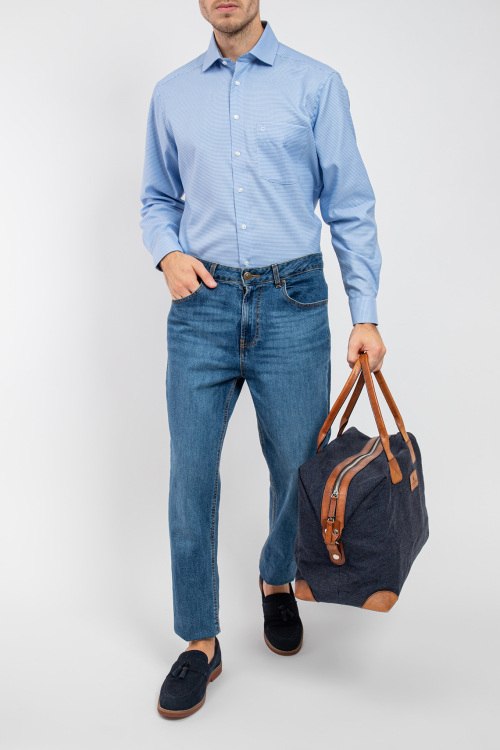 Мужская голубая хлопковая рубашка Modern Fit от Olymp (Олимп). Мелкий принт по всей поверхности, накладной карман на груди, отложной воротник, застежка на пуговицы, манжеты на пуговицах, классическая длина. Замеры для размера 41: длина 82 см, полу обхват груди 61 см, полу обхват талии 56 см, длина рукава 65 см.