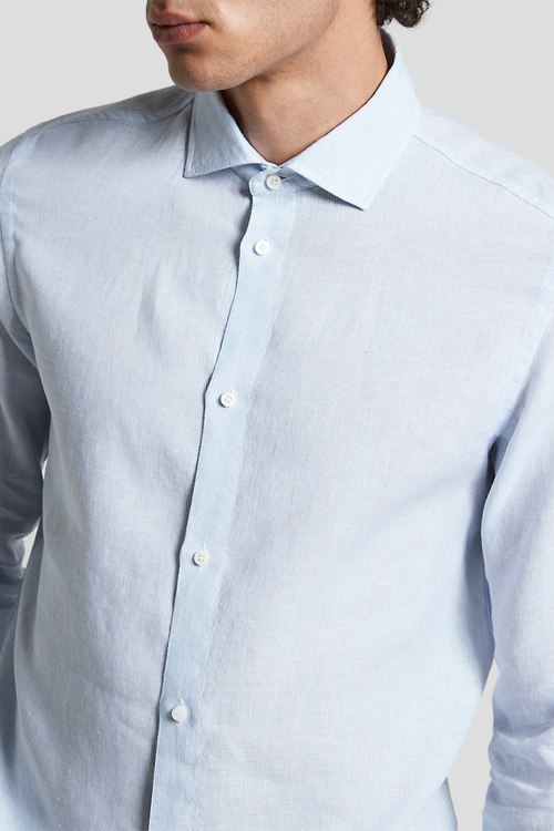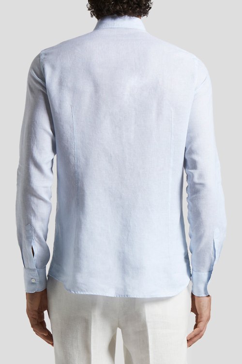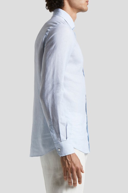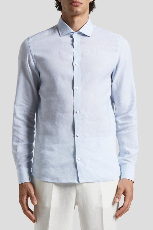 Детали: Мужская голубая рубашка из льна от Peserico (Пезерико). Классический воротник, застежка на пуговицы, длинные рукава, манжеты на пуговицах, фигурный низ изделия
