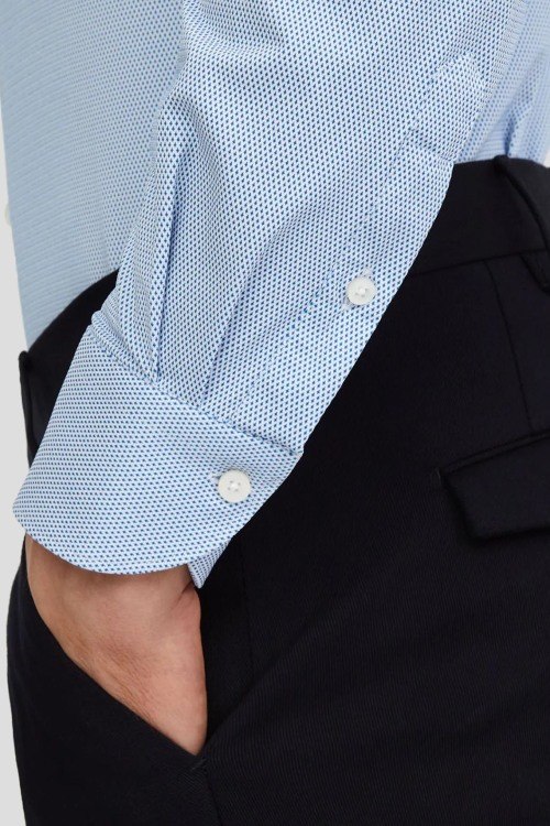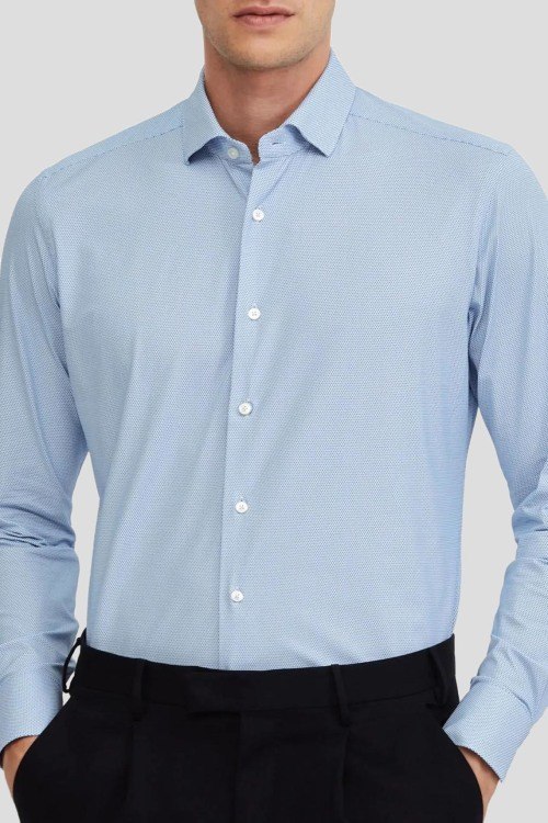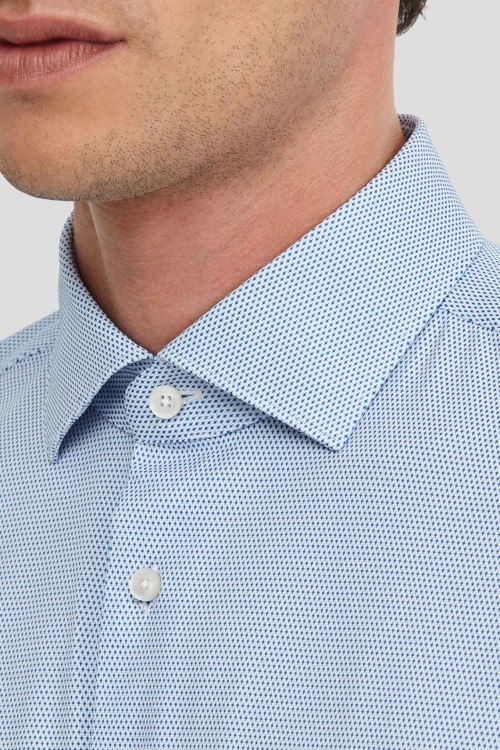 Детали: Мужская голубая рубашка от Xacus (Ксакус). Классический воротник, застежка на пуговицы, длинные рукава, манжеты на пуговицах, дизайн с узором по всей поверхности изделия