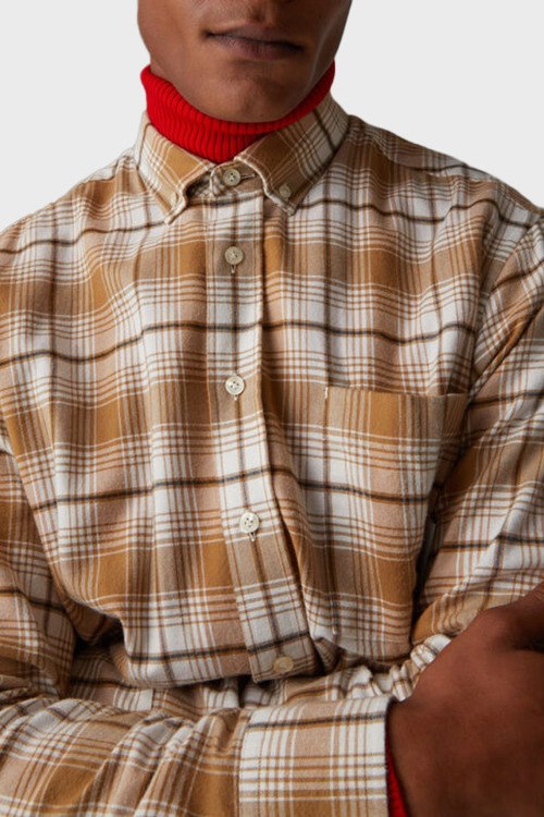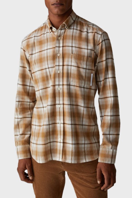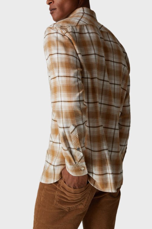 Детали: Мужская коричневая рубашка из хлопка и натуральной шерсти от Bogner (Богнер). Классическая длина, отложной воротник, застежка на пуговицы, длинные рукава, фигурный низ, накладной карман на груди, дизайн в клетку