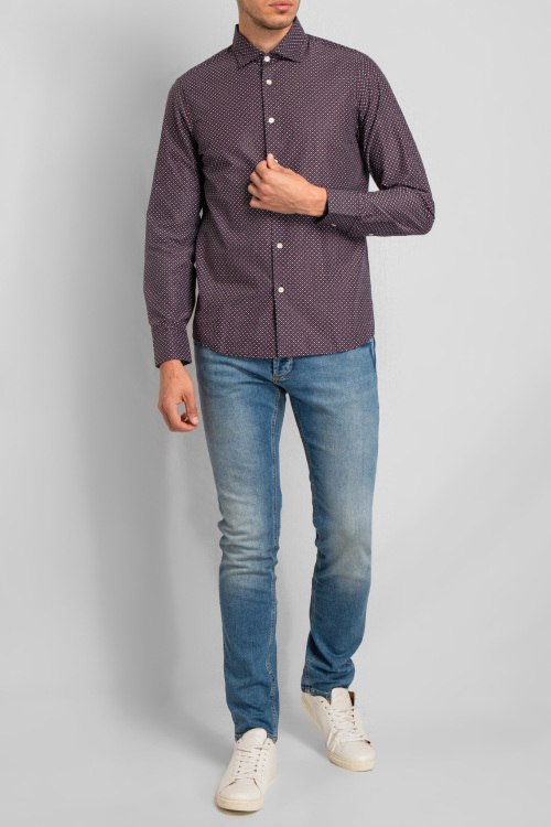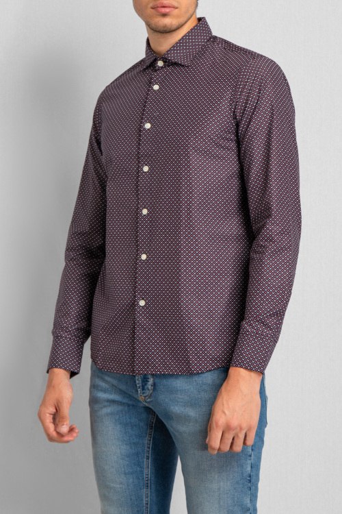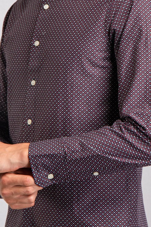 Мужская бордовая рубашка из хлопка от Emporio Armani (Эмпорио Армани). Модель с длинным рукавом, классическая длина, дизайн с узором по всей поверхности, отложной воротник, манжеты на пуговицах, спереди застегивается на пуговицы.