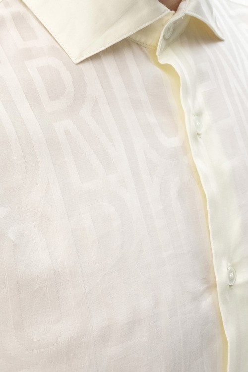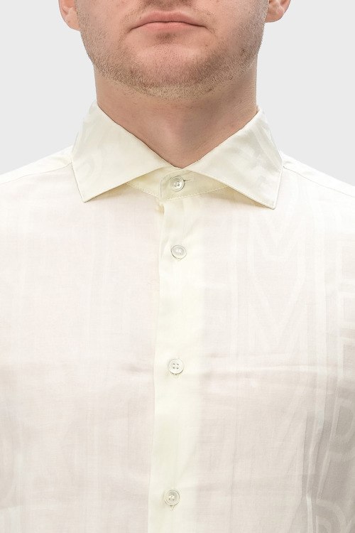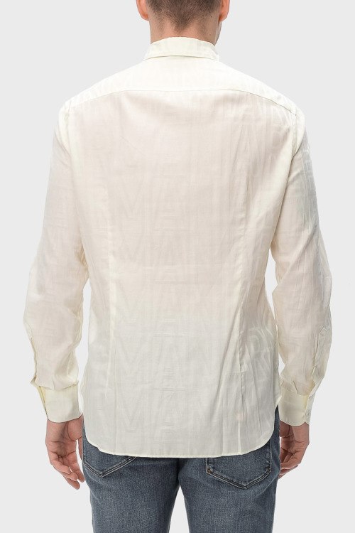 Мужская хлопковая рубашка молочного оттенка от Emporio Armani (Эмпорио Армани). Логотип по всей поверхности, отложной воротник, застежка на пуговицы, классическая длина