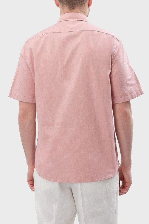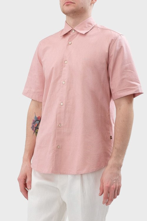 Детали: Мужская персиковая хлопковая рубашка Rash от Hugo Boss (Хуго Босс). Логотип на груди, отложной воротник. застежка на пуговицы, короткий рукав, классическая длина