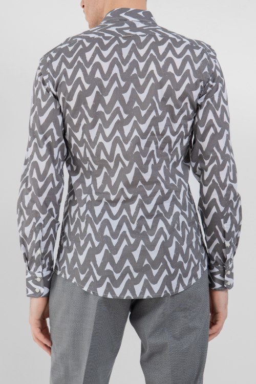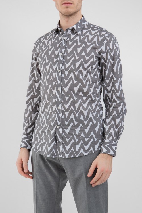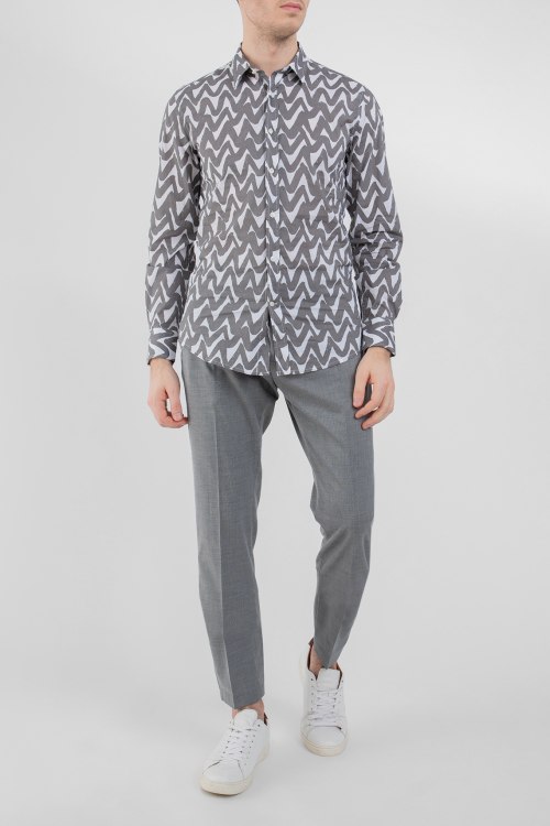 Мужская серая хлопковая рубашка от Antony Morato (Энтони Морато). Средняя длина, застегивается на пуговицы, классический воротник, длинные рукава, манжеты на пуговицах, узор по всему изделию.