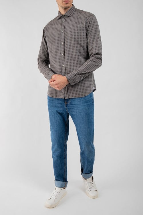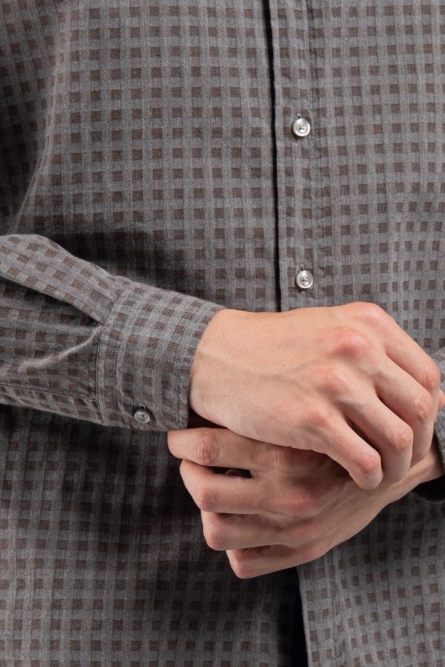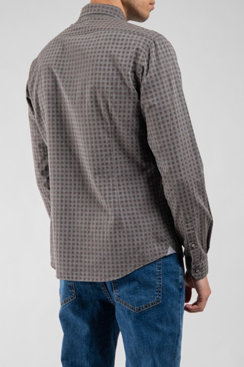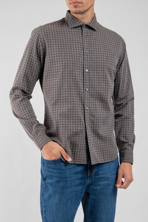 Мужская серая хлопковая рубашка от Michael Coal (Майкл Коул). Принт в клетку, классический воротник, застегивается на пуговицы, манжеты на пуговицах.