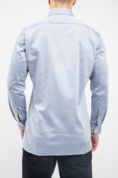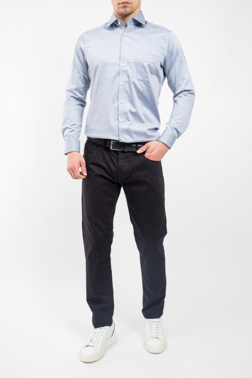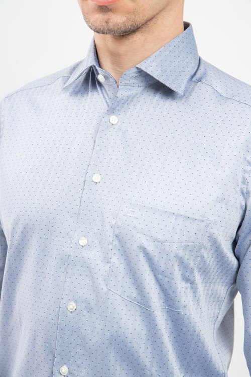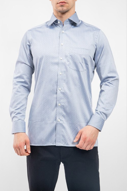 Мужская серая рубашка из хлопка от Olymp (Олимп). Классический воротник, застежка на пуговицы, длинные рукава, фигурный низ изделия.