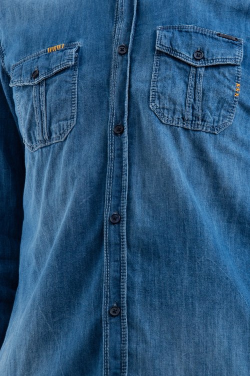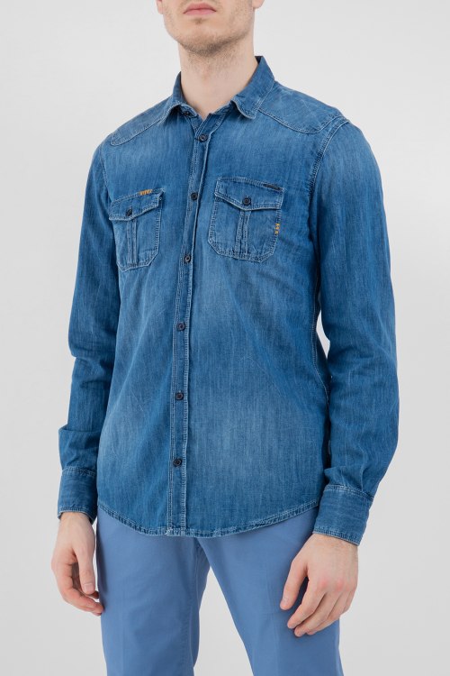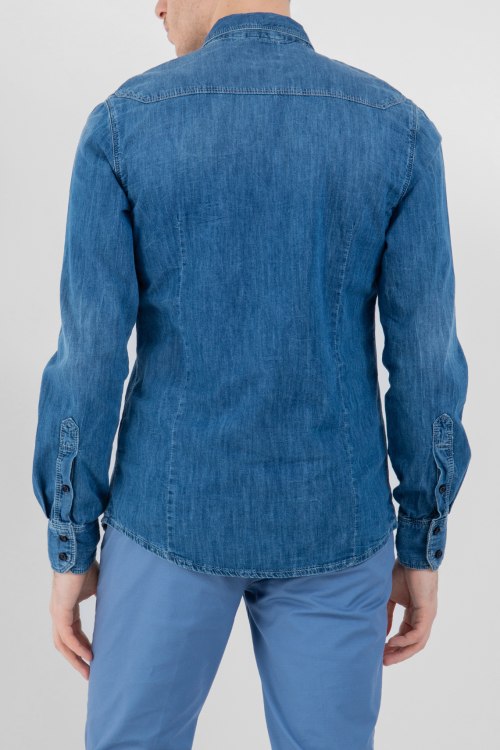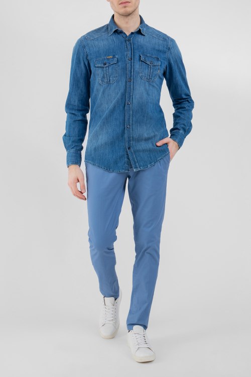 Мужская синяя джинсовая рубашка от Antony Morato (Энтони Морато). Средняя длина, застегивается на пуговицы, классический воротник, длинные рукава, манжеты на пуговицах, два нагрудных кармана.