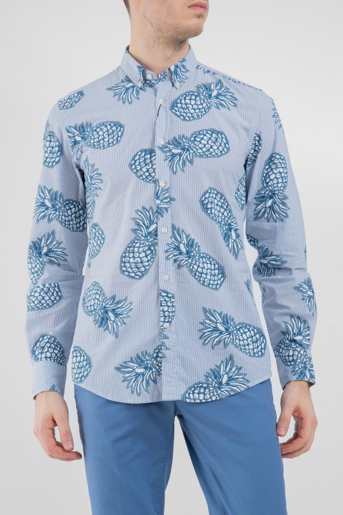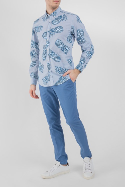 Мужская голубая рубашка от Antony Morato (Энтони Морато). Средняя длина, застегивается на пуговицы, классический воротник, длинные рукава, манжеты на пуговицах, тонкая полоска, принт по всему изделию.