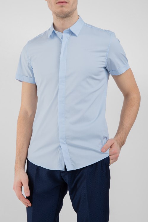 Мужская голубая хлопковая рубашка от Antony Morato (Энтони Морато). Средняя длина, застегивается на пуговицы, классический воротник, короткие рукава, скрытый ряд пуговиц.