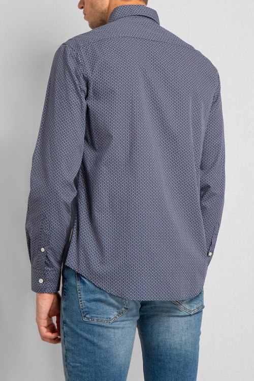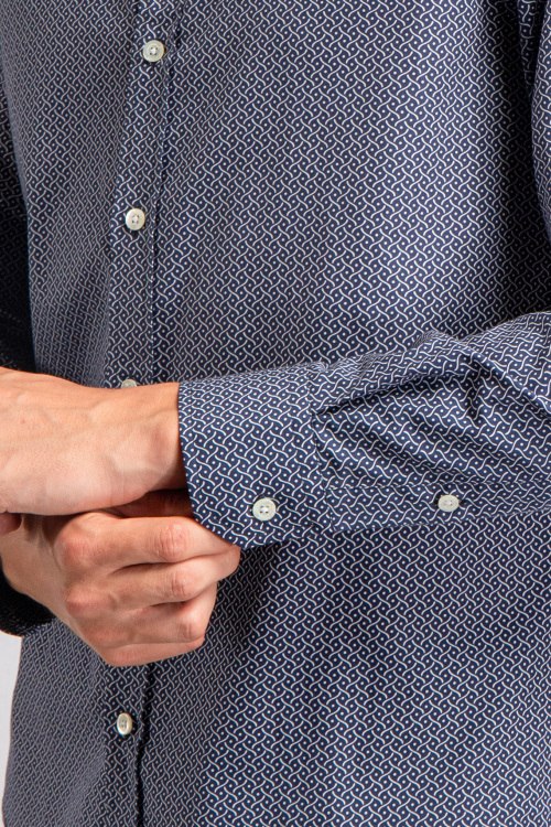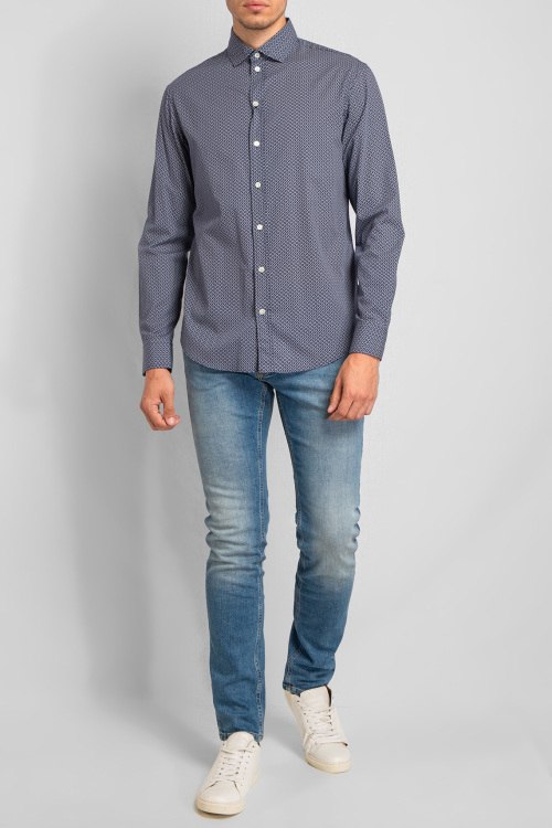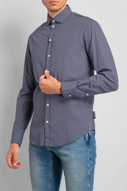 Мужская темно-синяя рубашка из хлопка от Emporio Armani (Эмпорио Армани). Модель длинными рукавами, отложной воротник, мелкий принт по всей поверхности, манжеты на пуговицах, застегивается на пуговицы.