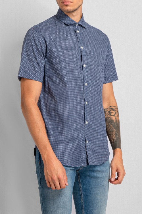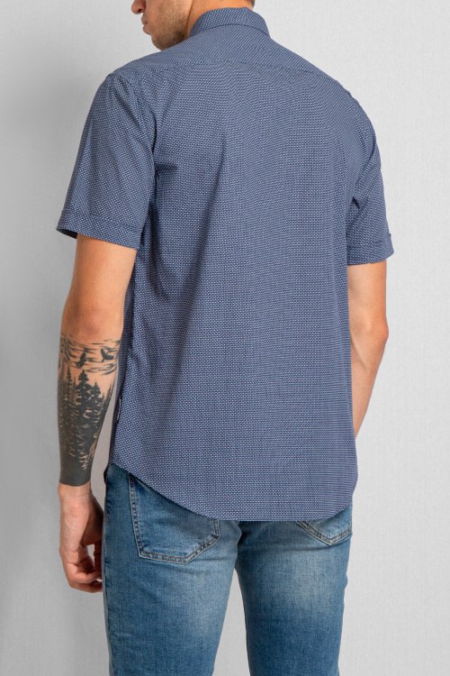 Мужская голубая рубашка из хлопка от Emporio Armani (Эмпорио Армани). Модель с короткими рукавами, отложной воротник, мелкий принт по всей поверхности, застегивается на пуговицы.