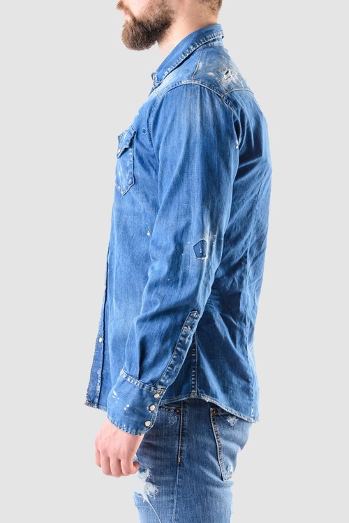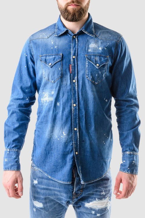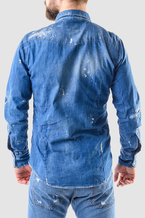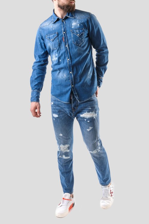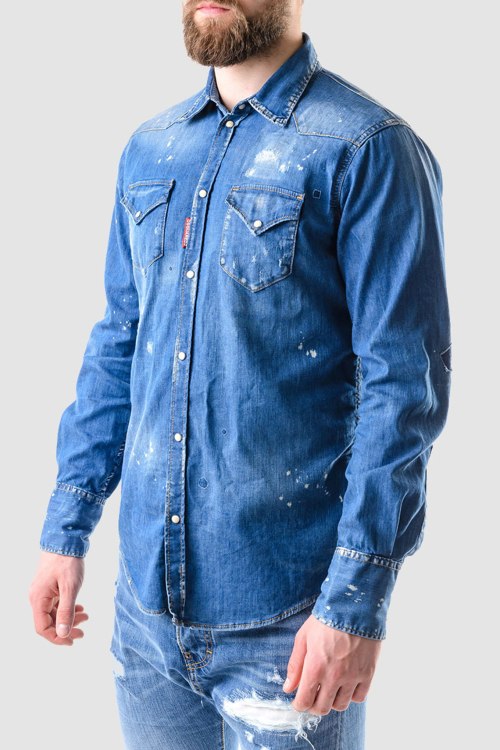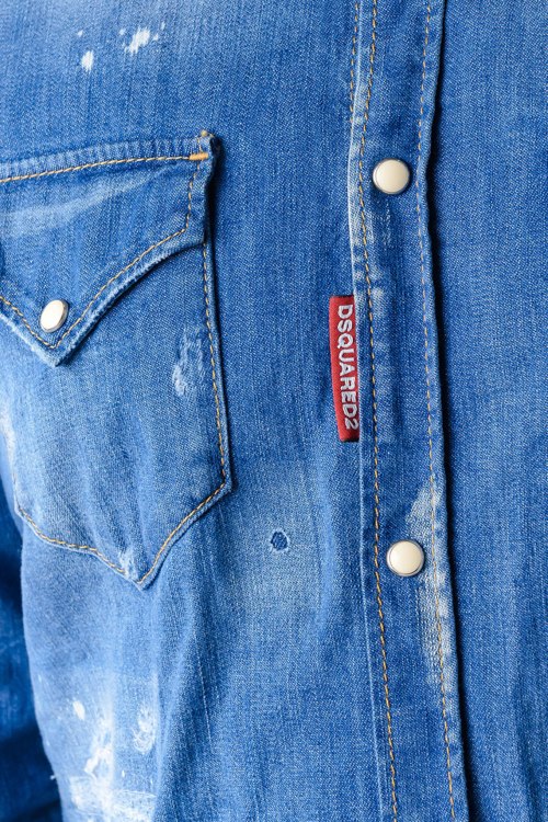 Детали: Мужская синяя джинсовая рубашка из хлопкового микса от Dsquared2 (Дискваред). Классический воротник, застежка на кнопки, длинные рукава, фигурный низ изделия, дизайн с потертостями, рванные детали