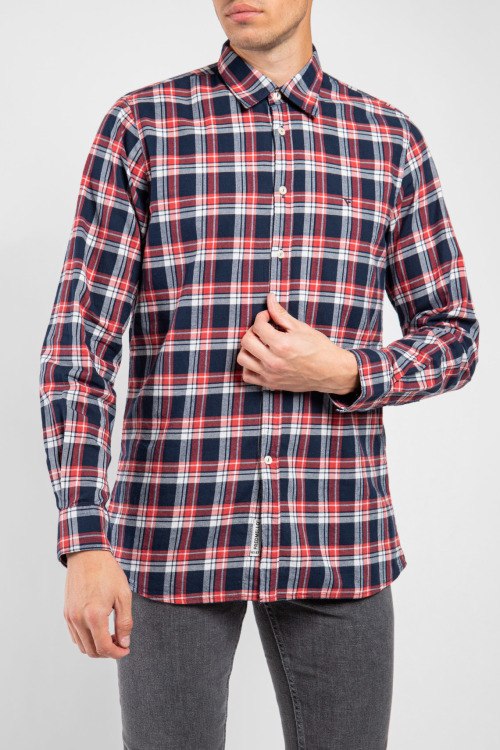 Детали: Мужская красно-синяя рубашка из хлопка от Fred Mello (Фред Мелло). Дизайн в клетку, отложной воротник, застежка на пуговицы, длинные рукава, манжеты на пуговицы, вышитый логотип бренда