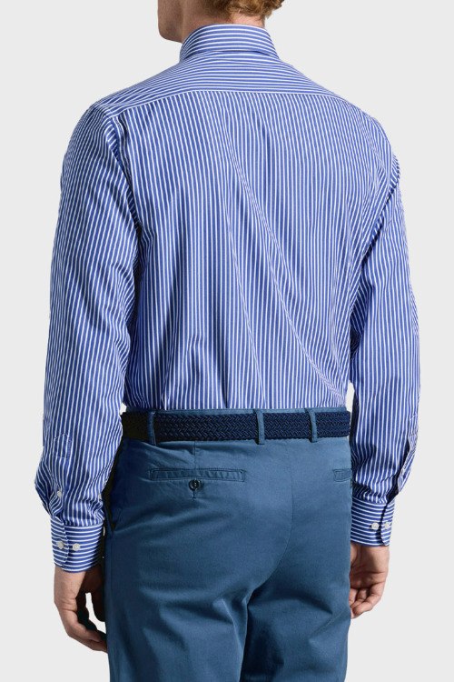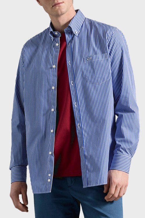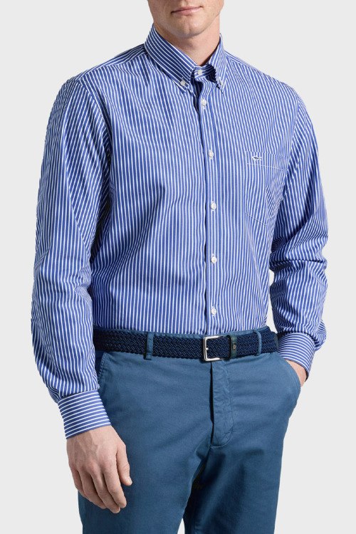Детали: Мужская синяя рубашка из хлопка от Paul & Shark (Пол энд Шарк). Классический воротник, застежка на пуговицы, дизайн в вертикальную полоску, длинные рукава, манжеты на пуговицы, нагрудный карман, патч-лого