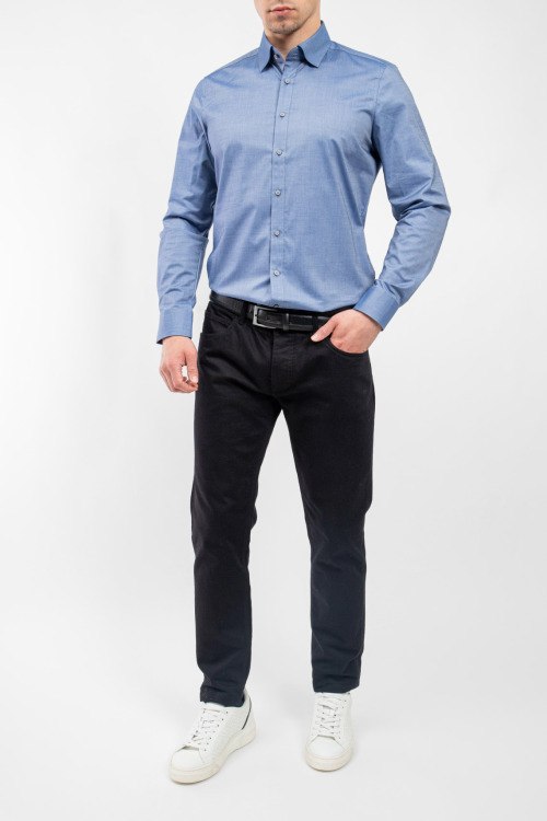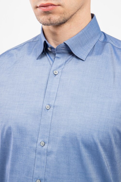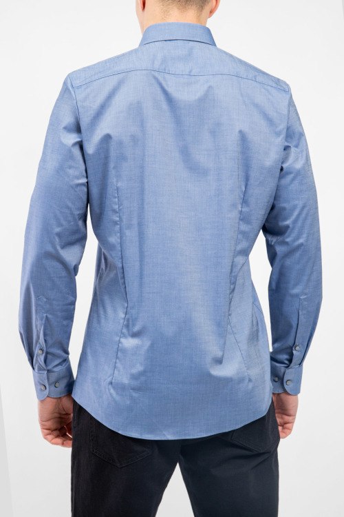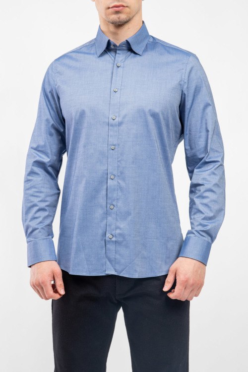 Мужская синяя рубашка из хлопкового микса от Olymp (Олимп). Классическая длина, застежка на пуговицы, длинные рукава, манжеты на пуговицах, фигурный низ изделия.