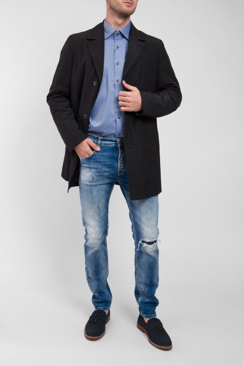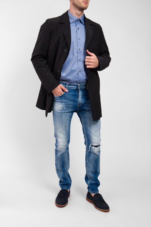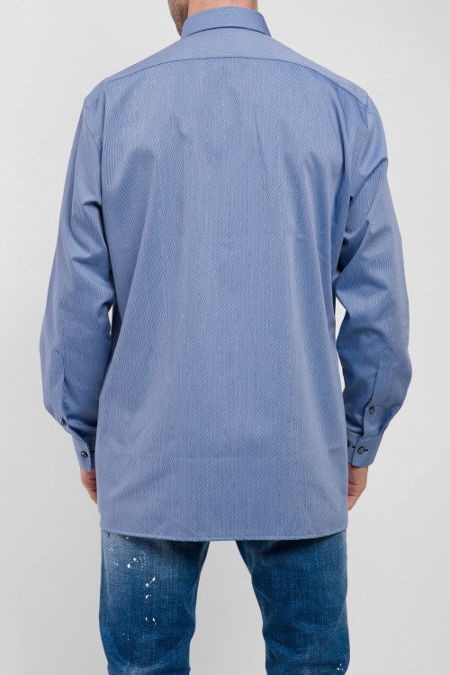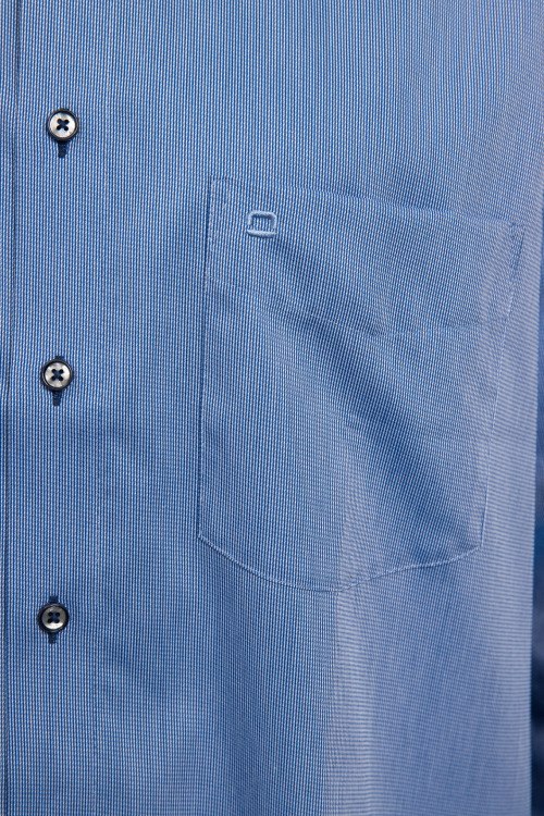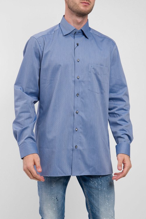 Мужская синяя рубашка из хлопка от Olymp (Олимп). Классический воротник, застежка на пуговицы, длинные рукава, манжеты на пуговицах, дизайн в тонкую полоску по всей поверхности изделия, ровный низ изделия, нагрудный карман, вышитый логотип бренда.