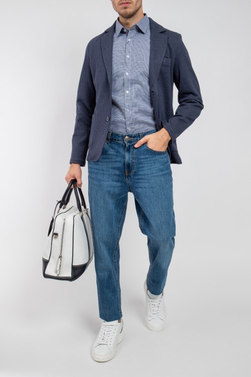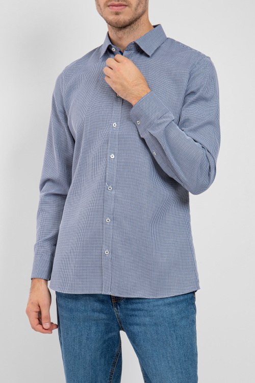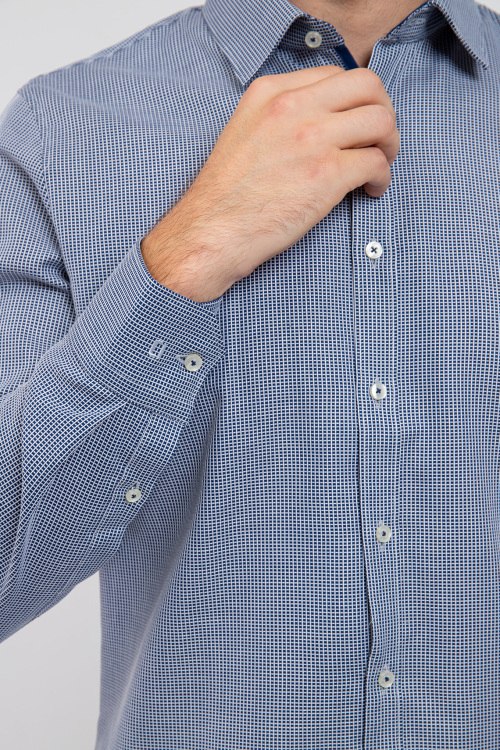 Мужская синяя хлопковая рубашка Super Slim от Olymp (Олимп). Мелкий принт по всей поверхности, отложной воротник, застежка на пуговицы, манжеты на пуговицах, классическая длина. Замеры для размера 42: длина 79 см, полу обхват груди 54 см, полу обхват талии 49 см, длина рукава 67 см.