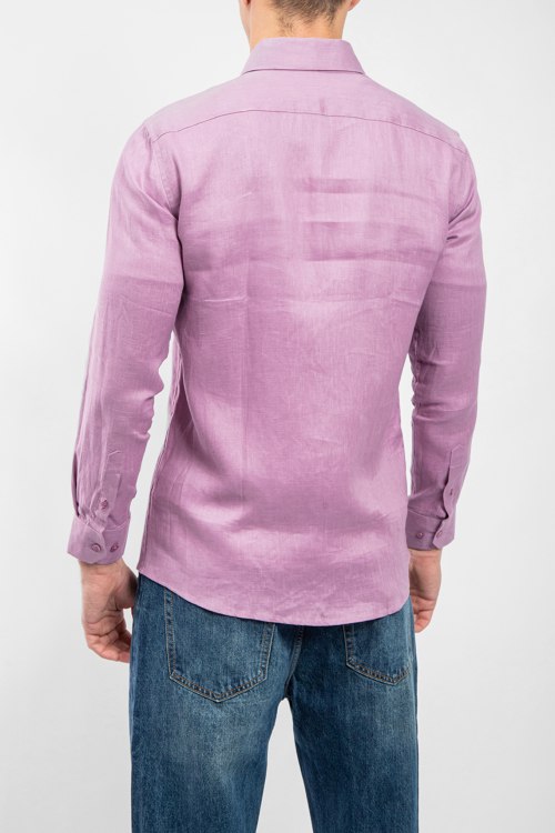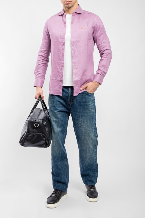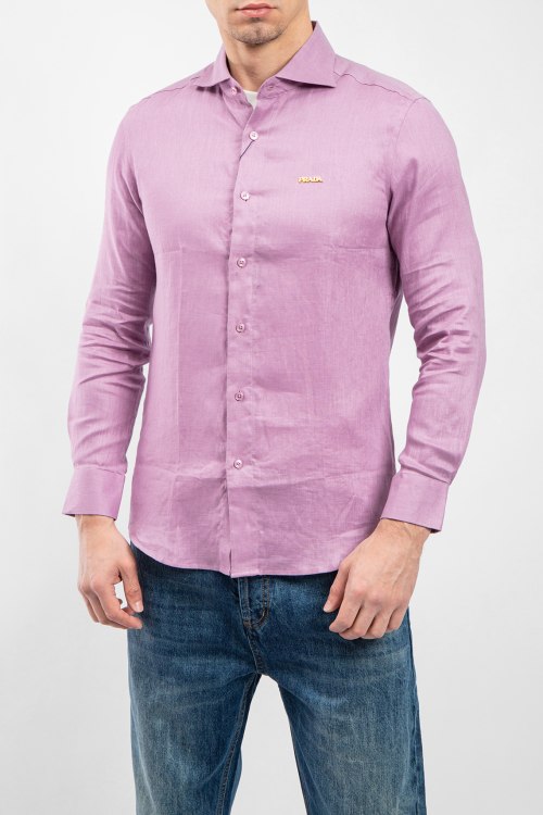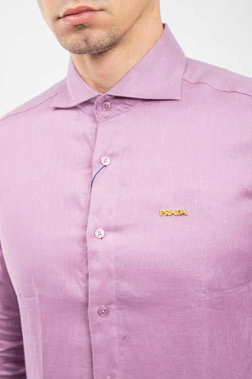 Детали: Мужская сиреневая льняная рубашка от Prada (Прада). Логотип на груди, отложной воротник, застежка на пуговицы, манжеты на пуговицах, классическая длина