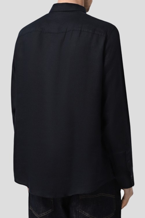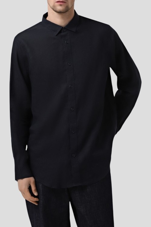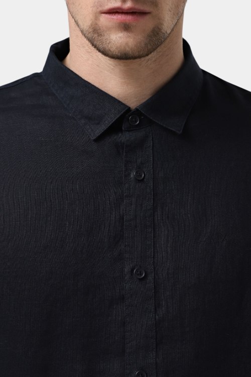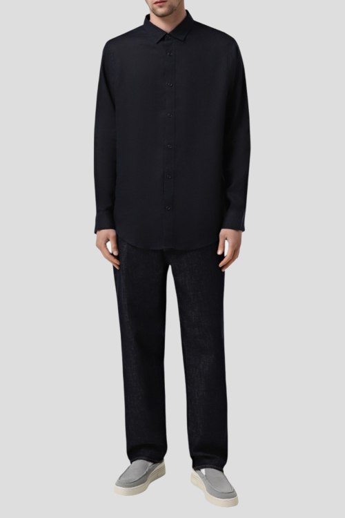 Детали: Мужская темно-синяя льняная рубашка от Armani Exchange (Армани Эксчендж). Отложной воротник, застежка на пуговицы, манжеты на пуговицах, классическая длина
