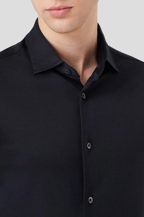 Детали: Мужская темно-синяя рубашка из лиоцелла и хлопка от Emporio Armani (Эмпорио Армани). Отложной воротник, короткий рукав: застежка на пуговицы, классическая длина