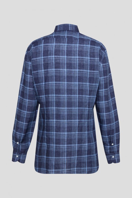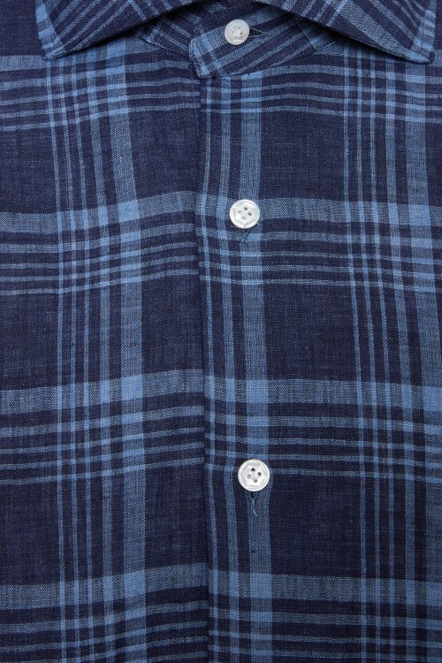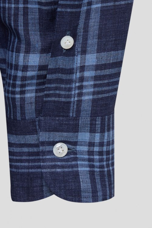Детали: Мужская темно-синяя льняная рубашка от Barba Napoli (Барба Наполи). Клетка по всей поверхности, отложной воротник, застежка на пуговицы, манжеты на пуговицах, закругленный нижний край. Обхват груди: для размера 41 - 110 см, обхват талии: для размера 41 - 104 см, длина изделия по среднему шву спинки от горловины: для размера 41 - 83 см, длина рукава: длинный, для размера 41 - 68 см