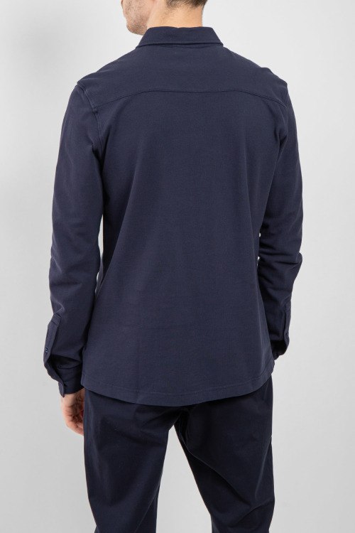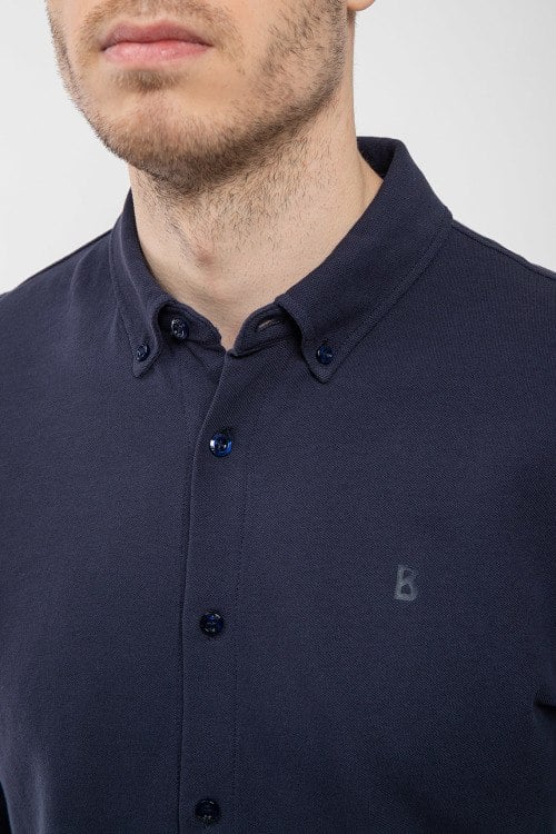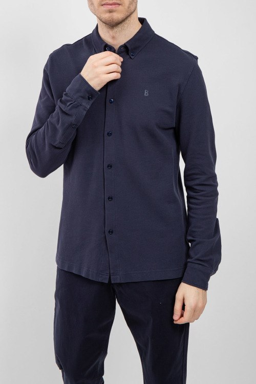 Мужская темно-синяя рубашка Franz из хлопкового микса от Bogner (Богнер). Классический воротник, застежка на пуговицы, длинные рукава, логотип на груди, фигурный низ изделия.