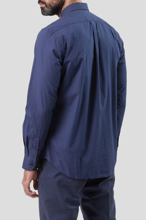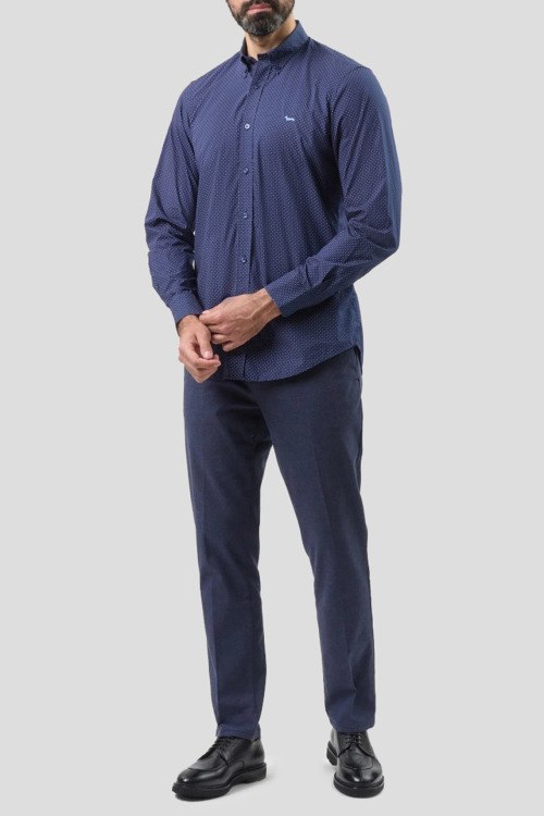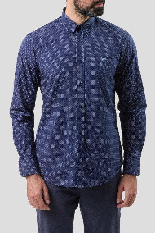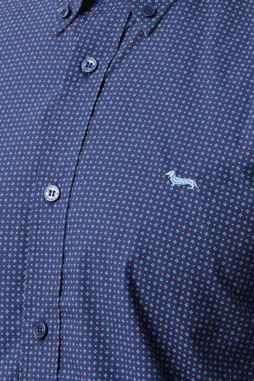 Детали: Мужская темно-синяя хлопковая рубашка от Harmont & Blaine (Хармонт энд Блейн). Мелкий принт по всей поверхности, логотип на груди, отложной воротник, застежка на пуговицы, манжеты на пуговицах, закругленный нижний край, классическая длина