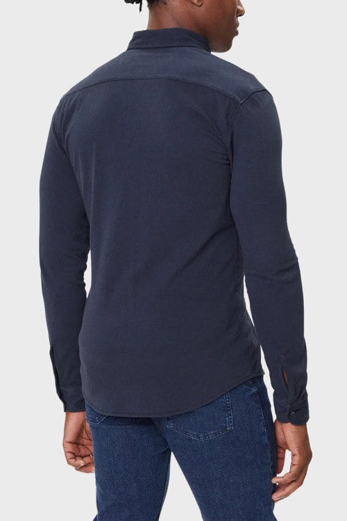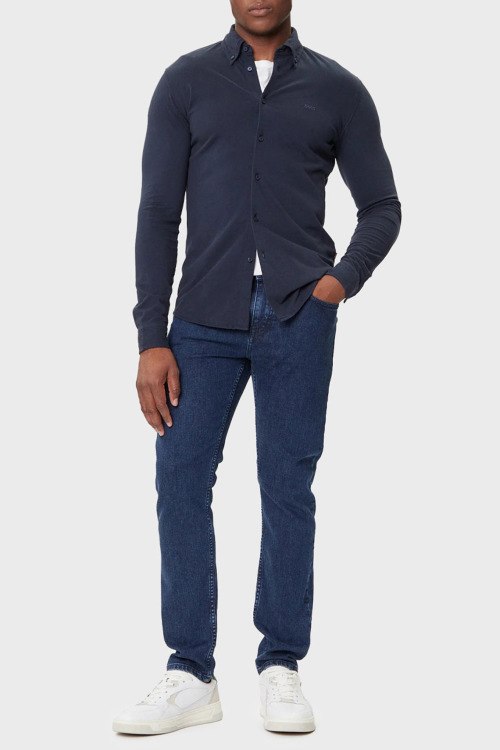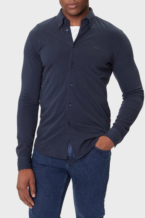Детали: Мужская темно-синяя хлопковая рубашка Myjersey от Hugo Boss (Хуго Босс). Логотип на груди, отложной воротник, застежка на пуговицы, манжеты на пуговицах, классическая длина