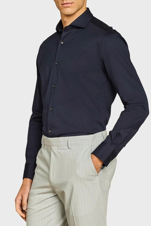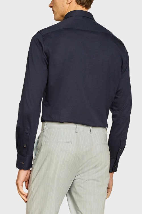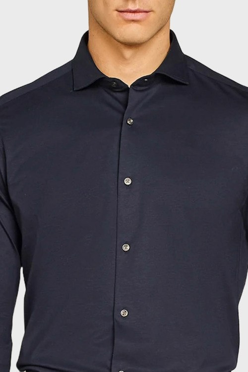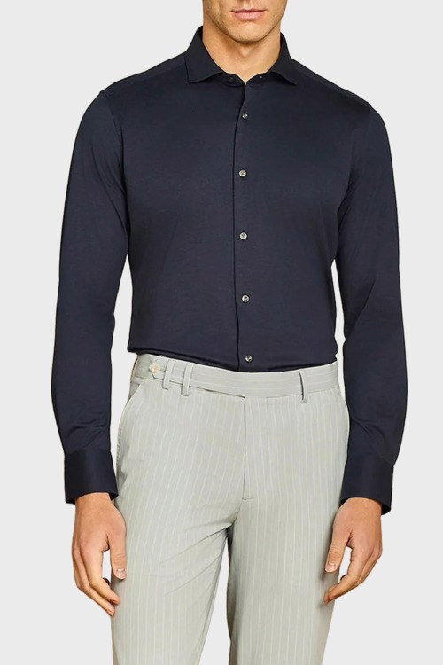 Детали: Мужская темно-синяя хлопковая рубашка от Paul Taylor (Пол Тейлор). Отложной воротник, застежка на пуговицы, манжеты на пуговицах, классическая длина
