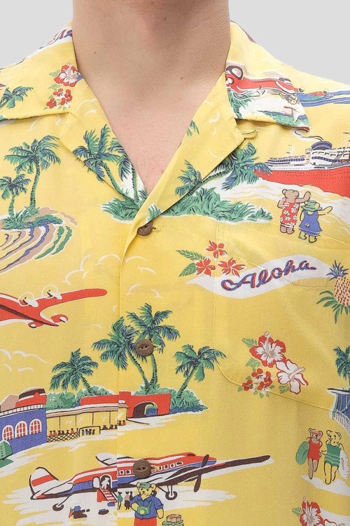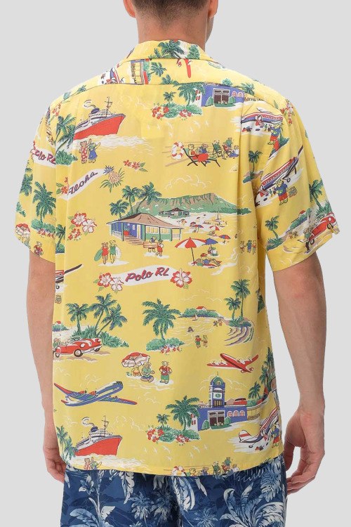 Детали: Мужская желтая гавайская рубашка из вискозы от Polo Ralph Lauren (Поло Ральф Лорен). Принт по всей поверхности, карман на груди, отложной воротник, короткий рукав, застежка на пуговицы, классическая длина