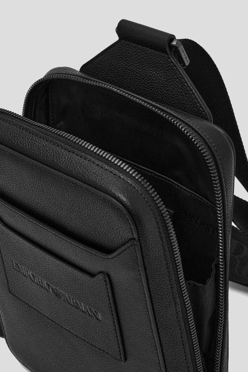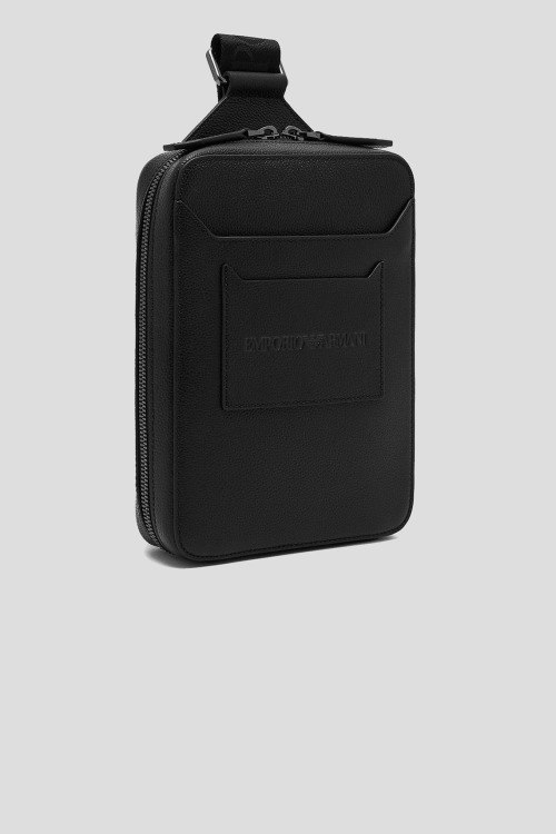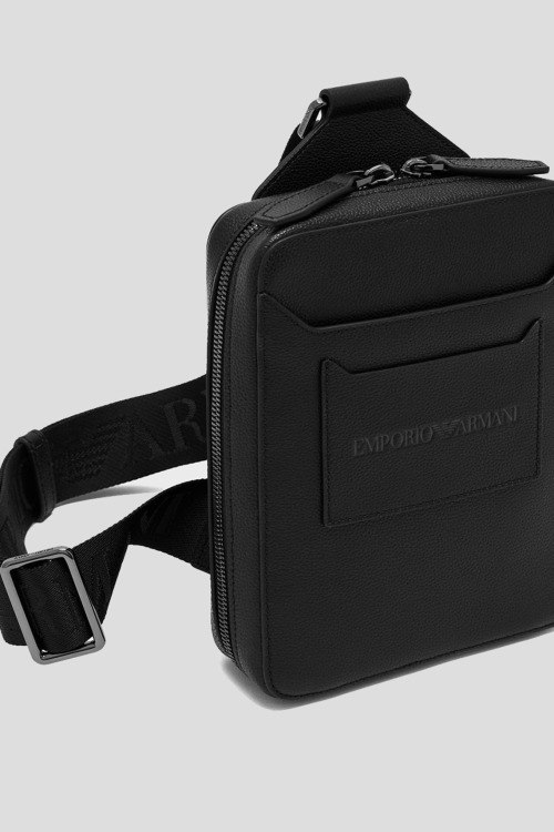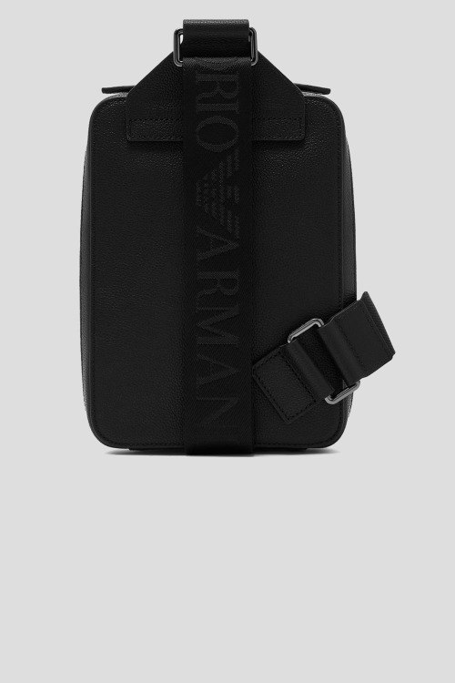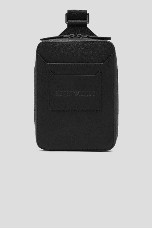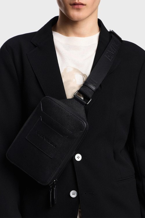 Детали: Мужская черная кожаная сумка-слинг от Emporio Armani (Эмпорио Армани). Модель из зернистой кожи, тиснение логотипа, застежка-молния, одно отделение, регулируемый плечевой ремень. Размеры: 15 x 4 x 21 см