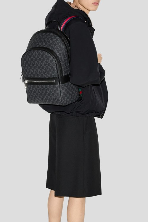 Детали: Мужской черный рюкзак из канвы GG Medium Backpack от Gucci (Гуччи). Монограмма GG по всей поверхности, два внешних кармана на молнии, застежка-молния, одно отделение, верхняя ручка, текстильные плечевые ремни с полоской Web. Размеры: ширина - 28 см, глубина - 15,5 см, высота - 44 см