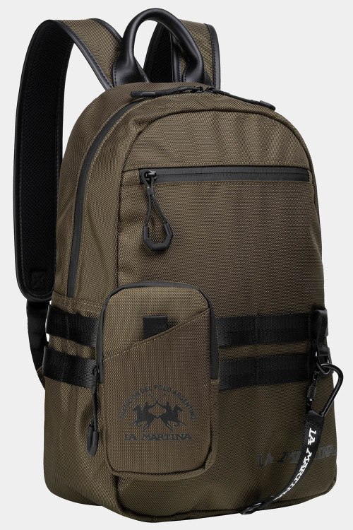 Детали: Мужской текстильный рюкзак цвета хаки от La Martina (Ла Мартина). Ввнутри имеет специальное крепление для ноутбука или планшета. Идет в комплекте с небольшой сумкой, которую можно отстегнуть и использовать по отдельности. Крепкий материал, две мягкие лямки с регулируемой длиной, короткая ручка-петля сверху, основное отделение с внутренним органайзером, дополнительные карманы, принты с символикой бренда. Размер: 26 x 39,5 x 11,5 см