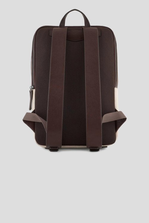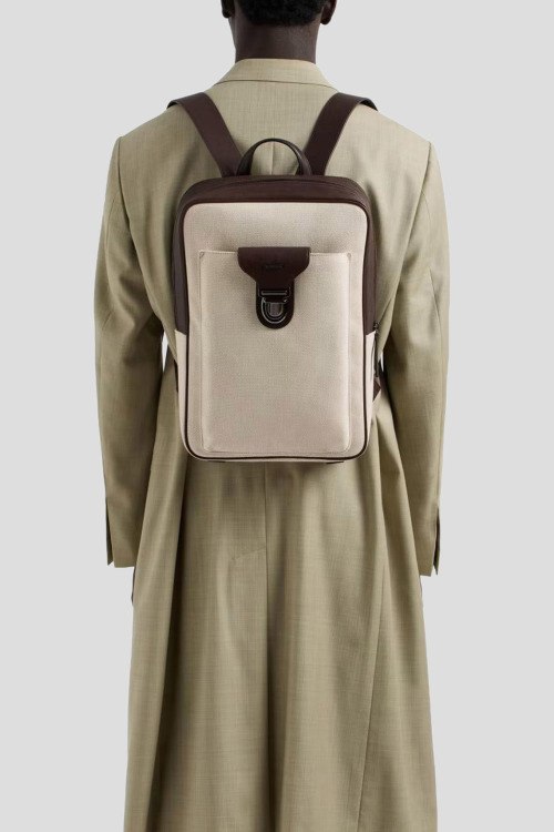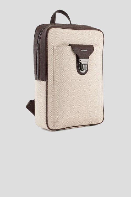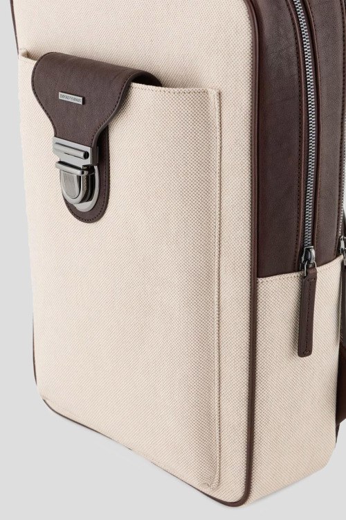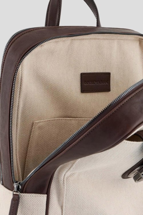 Мужской хлопковый рюкзак молочного оттенка от Emporio Armani (Эмпорио Армани). Кожаная отделка, внешний карман, застежка-молния, верхняя ручка, регулируемые плечевые ремни, одно отделение. Размеры: 38 x 29 x 9 см