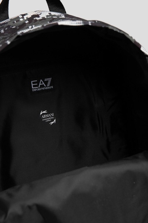 Детали: Мужской разноцветный текстильный рюкзак от EA7 Emporio Armani (ЕА7 Эмпорио Армани). Комбинация цветов, накладной карман на молнии, принт с логотипом, верхняя ручка, регулируемые плечевые ремни, застежка-молния, одно отделение. Размеры: высота: 39 см, ширина: 26 см, высота ручек: 6 см, ширина по дну: 16 см