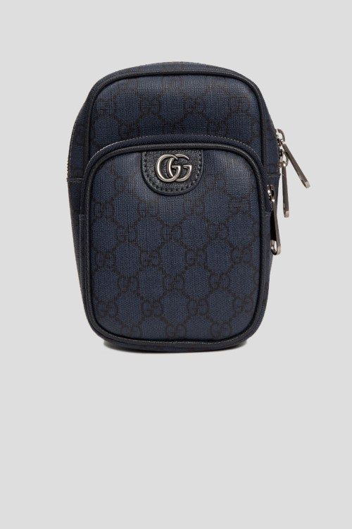 Детали: Мужская темно-синяя кожаная сумка-слинг Ophidia от Gucci (Гуччи). Узор GG Supreme, нашивка с логотипом Double G, накладной карман на молнии, застежка-молния, одно отделение, регулируемый плечевой ремень. Размеры: ширина 13 см, высота 19,5 см, глубина 6,5 см