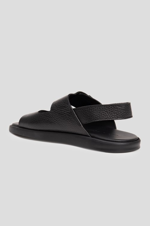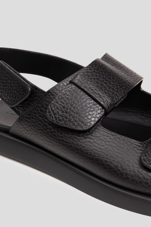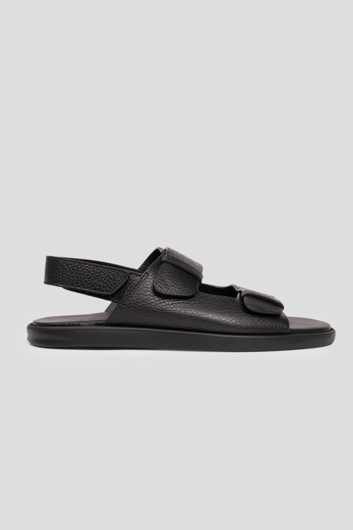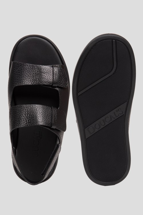 Детали: Мужские черные кожаные сандалии от Doucal's (Дукалс). Модель из зернистой кожи, два ремешка спереди, ремешок с липучкой на пятке, закругленный носок
