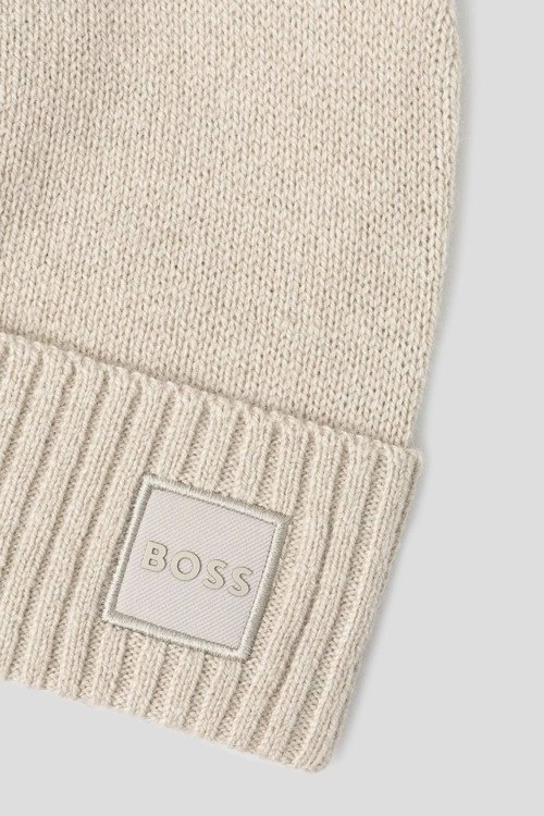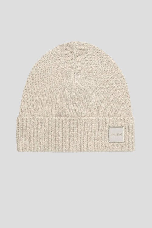 Детали: Мужская бежевая шапка из микса шерсти и хлопка от Hugo Boss (Хуго Босс). Модель бини, дизайн с отворотом, патч-лого