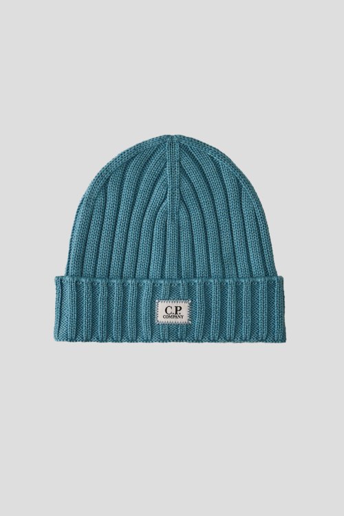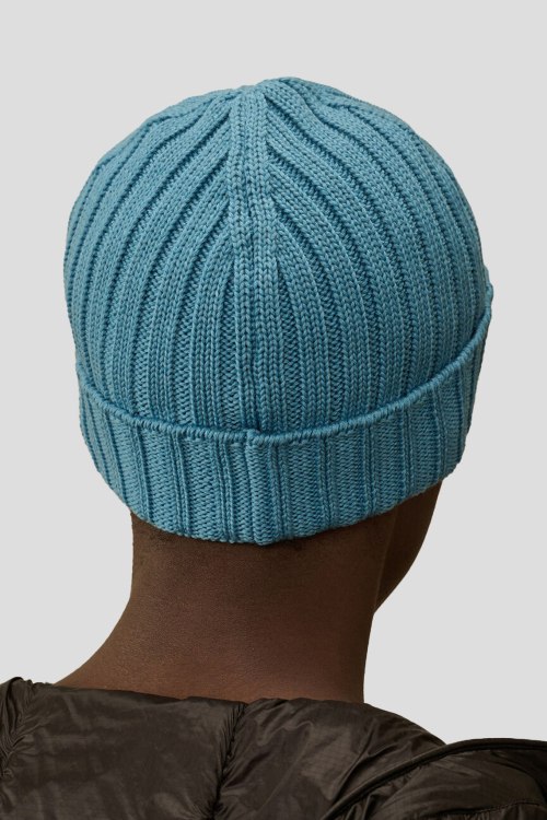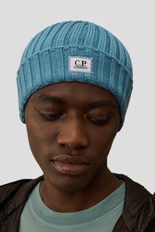 Детали: Мужская бирюзовая шерстяная шапка бини от C.P. Company (СиПи Компани). Крупная вязка, нашивка с логотипом, широкий отворот