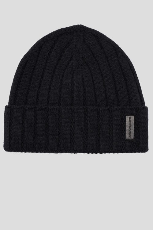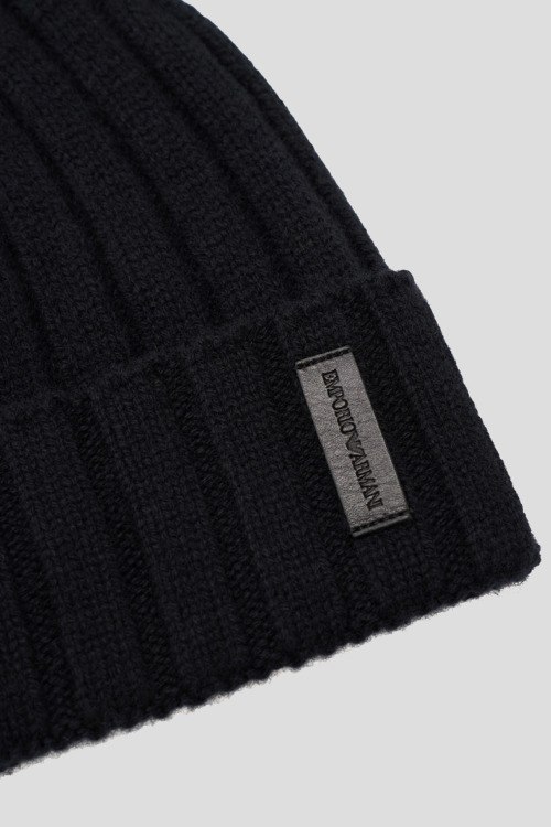 Детали: Мужская черная шапка бини из шерсти и кашемира от Emporio Armani (Эмпорио Армани). Классическая вязка, нашивка с логотипом, широкий отворот