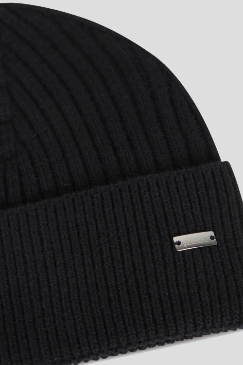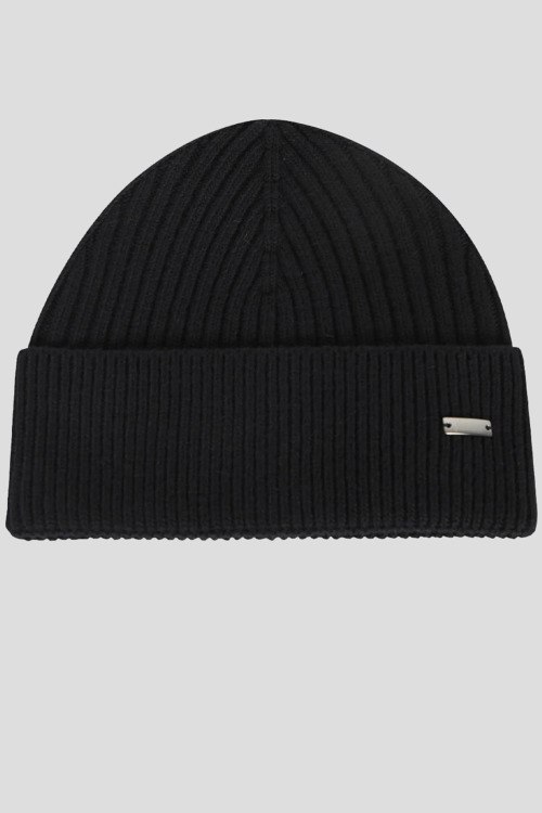 Детали: Мужская черная шапка из шерсти от Herno (Эрно). Дизайн в рубчик, модель бини, широкий отворот, патч-лого