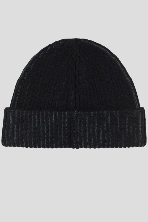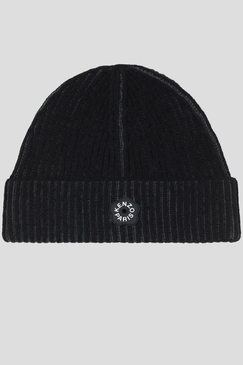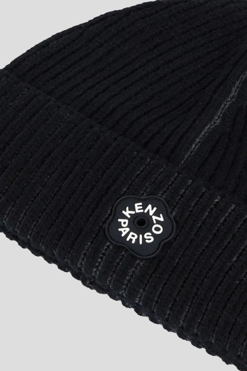 Детали: Мужская черная шапка из хлопка и шерсти от Kenzo (Кензо). Модель бини, дизайн с отворотом, логотип бренда