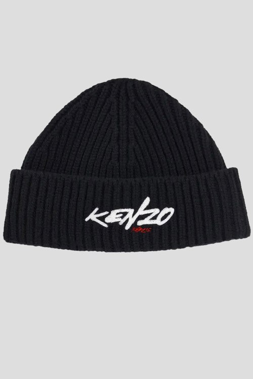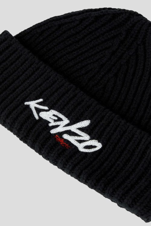 Детали: Мужская черная шапка из шерстяного микса от Kenzo (Кензо). Дизайн с вышитым лого, модель бини, широкий отворот