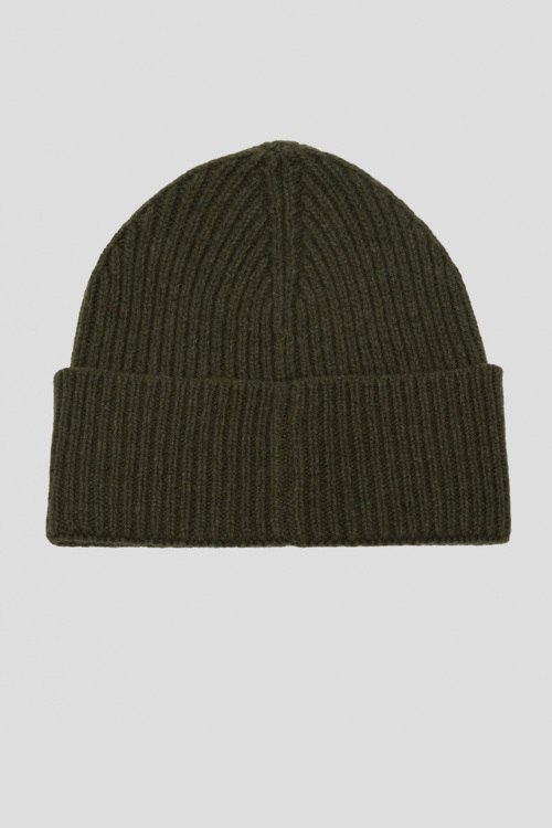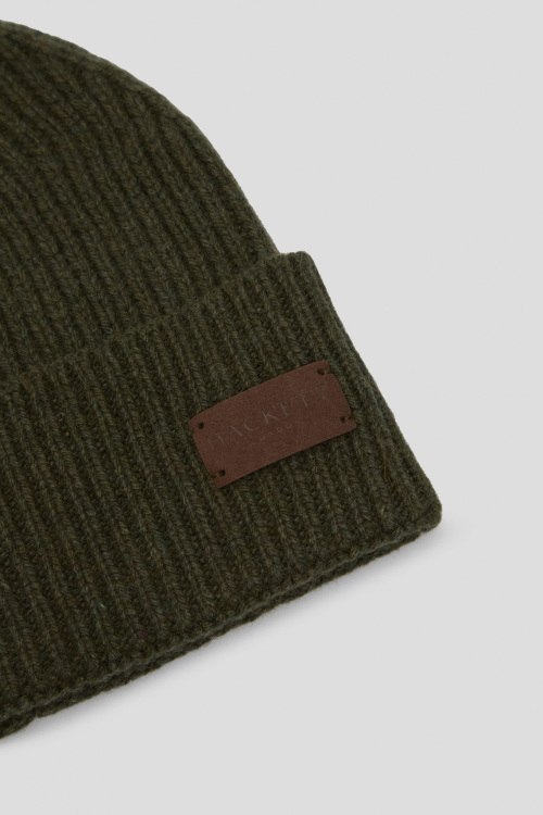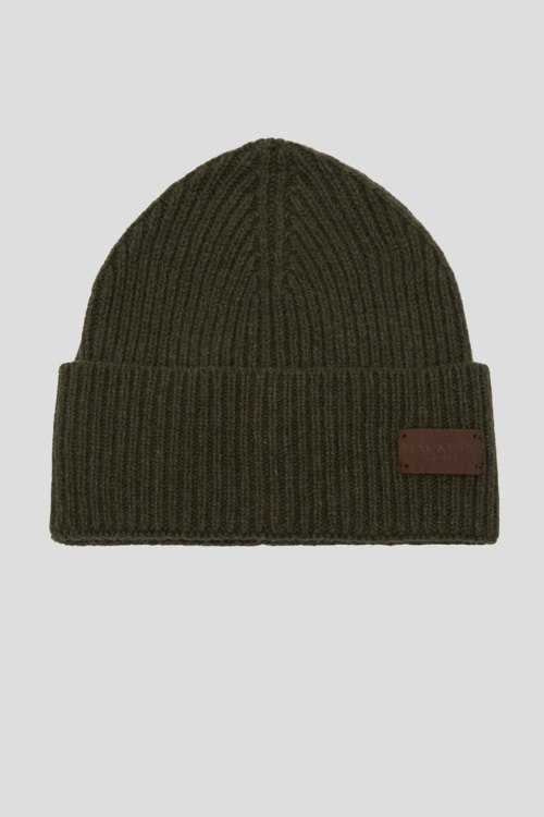 Детали: Мужская темно-зеленая шапка из кашемира и шерсти от Hackett (Хаккетт). Дизайн в рубчик, широкий отворот, патч-лого, модель бини
