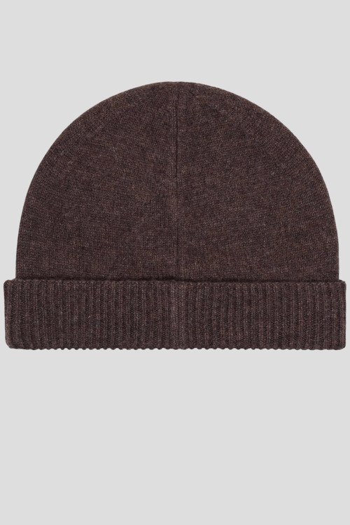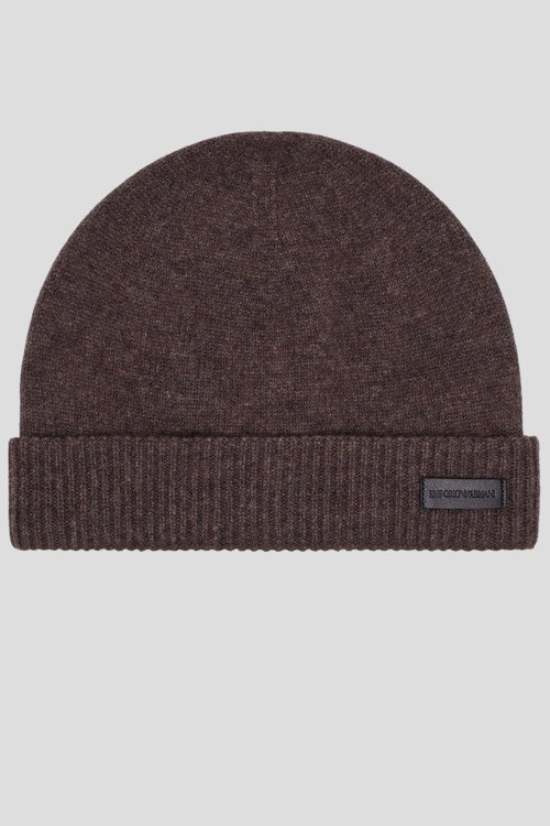 Детали: Мужская коричневая кашемировая шапка бини от Emporio Armani (Эмпорио Армани). Классическая вязка, нашивка с логотипом, широкий отворот