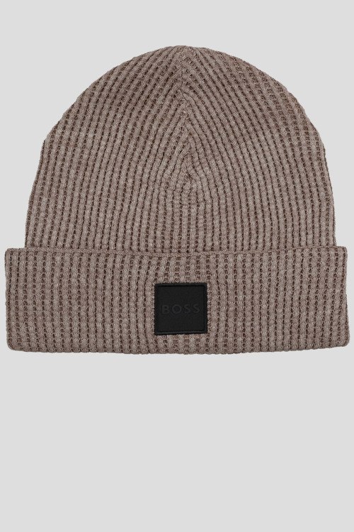 Детали: Мужская коричневая шапка из хлопка от Hugo Boss (Хуго Босс). Дизайн в рубчик, модель бини, широкий отворот, патч-лого