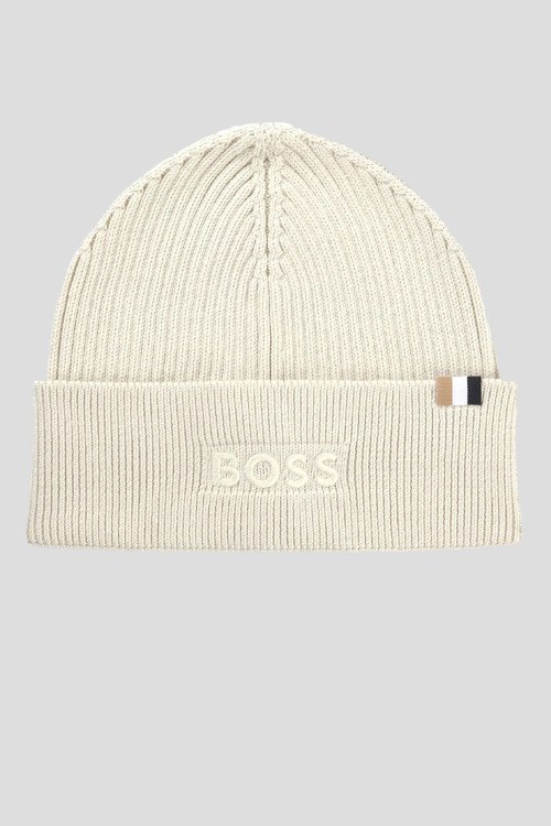 Детали: Мужская шапка молочного оттенка из хлопка и шерсти от Hugo Boss (Хуго Босс). Дизайн бини, широкий отворот, вышитый логотип бренда