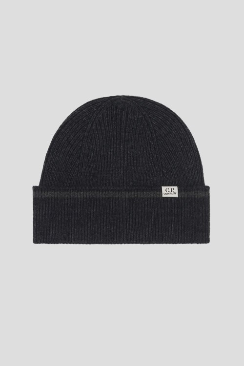 Детали: Мужская темно-серая шапка бини из нейлона и шерсти от C.P. Company (СиПи Компани). Классическая вязка, нашивка с логотипом, широкий отворот