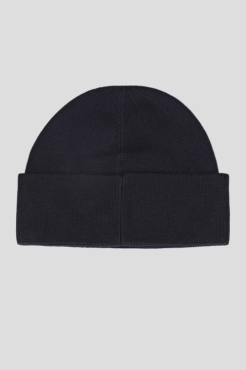 Детали: Мужская темно-синяя шапка бини из шерсти и хлопка от Armani Exchange (Армани Эксчендж). Облегающий фасон, нашивка с логотипом, широкий отворот